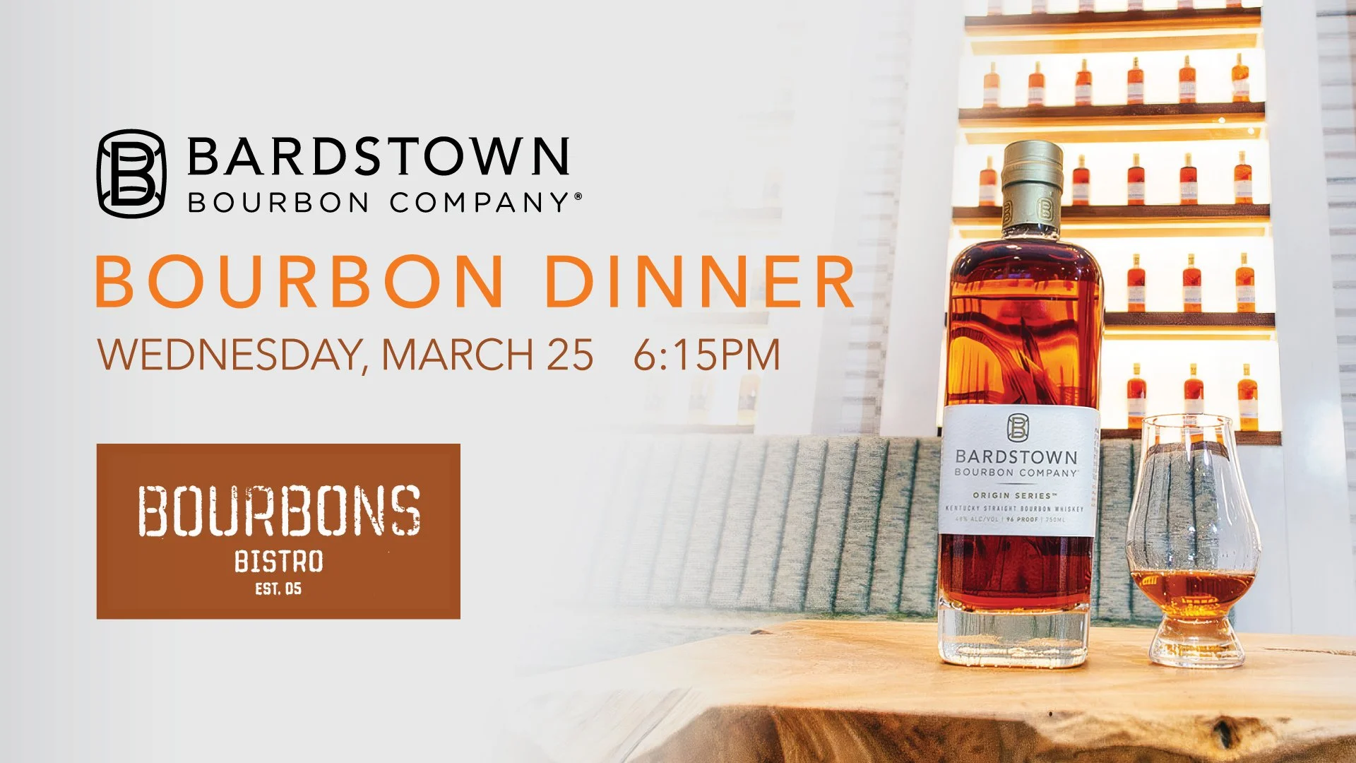 Join us and the Bardstown Bourbon Company in our private Rick Room on Wednesday, March 25 at 6:15pm for a gourmet three-course meal from our own Chef McFarland.
